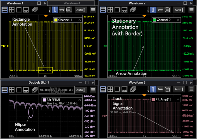 You can add annotations to the oscilloscope's display. Annotations are useful for documentation purposes, to add notes before capturing screens.