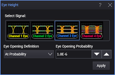 - Additional fields are displayed as shown in the following picture. Enter the desired BER in the Eye Opening Probability field, which represents the ratio of total hits in a waveform database column that can occur in the eye's opening. The probability can be set from 1 x 10–1 to 1 x 10–9 with the default setting being 1 x 10–2.
