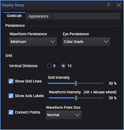 Use the Graticule tab of the Display Setup dialog box to configure how waveforms and grids appear.