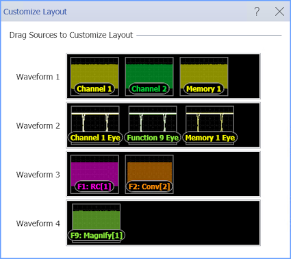 The Customize Layout dialog box lets you assign waveforms to particular windows. There are four waveform windows that can be used to hold time domain waveforms.
