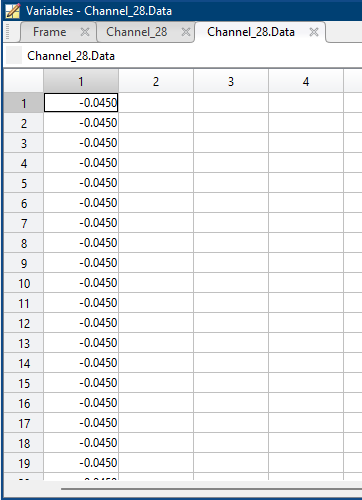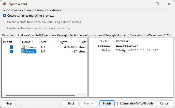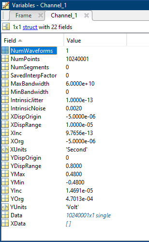 When Infiniium saves waveforms to a .mat file, included are one variable for the frame and one variable for each waveform. The waveform variables are named according to the memory or channel the data was saved from, where spaces are replaced with underscores to abide by MATLAB variable naming guidelines.