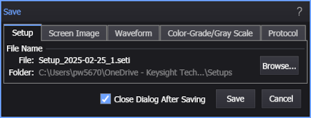 In the Save dialog box, use the Setup tab to save the current instrument setup to a file. When loading back into Infiniium, the file restores the application's settings to those in place at the time that the file was saved. You can save the setup to the instrument's internal hard disk or an external memory device. To open a setup file, see Open Setup Files.