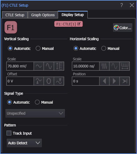 Use the Display Setup settings to control the display of the CTLE operator's output waveform, including turning the display on or off. Use the Name field to display an identifying name to the waveform which can be helpful for screen captures or when multiple waveforms are displayed. The settings also include the output waveform's color, scaling, and signal type. The scaling Automatic selection allows the output waveform to track changes to the scaling of the input waveform. This is the setting that you would normally want to use.