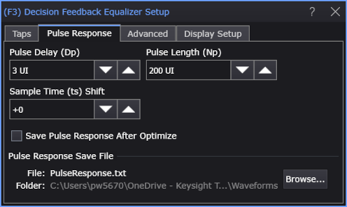 When Use Pulse Response or Use Pulse Response Optimization is selected in the Decision Feedback Equalizer Setup dialog box's Taps tab, use the Pulse Response tab to optimize the equalization that is applied to the pulse response. This tab lets you adjust the pulse delay (Dp) as well as the pulse length (Np) in UI.