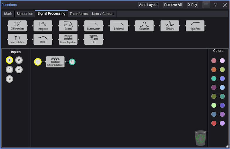 - Drag a function color icon over the output of the Linear Equalizer operator as shown in this figure. If not already placed, drag the channel 1 icon to the input of the operator. In this example, the function color icon determines the color of the displayed output waveform.