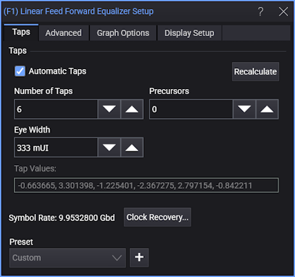 - Experiment changing the Number of Taps, Precursors, and Taps/UI fields to see how they affect the eye diagram.