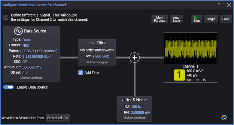 - In the Configure Simulation Source for Channel dialog box, define a 9.95328 GBd PRBS 7-1 (127 symbols) signal. In the Filter field, select 4th order Butterworth. Enter a Filter Bandwidth of 2.8 GHz.