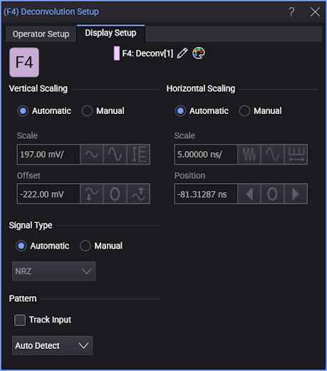 Each operator's setup includes a Setup section that has the selections that are shown in the following generic setup dialog box. Use these settings to control the display of the operator's output waveform, including turning the display on or off. Use the Name field to display an identifying name to the waveform which can be helpful for screen captures or when multiple waveforms are displayed. The settings also include the output waveform's color, scaling, and signal type. The scaling Automatic selection allows the output waveform to track changes to the scaling of the input waveform. This is the setting that you would normally want to use.