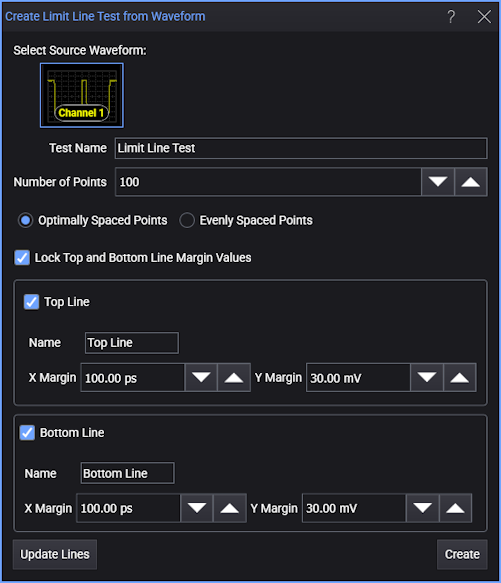 The Create Limit Line Test from Waveform dialog box automatically draws maximum and minimum limit lines at specified offsets from a displayed waveform. Use it to quickly create accurate limit lines for testing waveforms against a golden device.