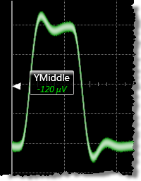 Amplitude at Middle is the measure of the amplitude value of the middle threshold. This measurement may be compatible with PAM signals, depending on the PAM waveform. The measurement can be restricted to a region. An annotation is placed on the display at the measured value. By default, this is the standard IEEE 50% threshold measurement level definition. The middle threshold value can be set to 50% or a custom value. The Waveform Base and Waveform Top are first located and these values are used to determine the threshold value.