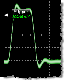 Amplitude at Upper is the measure of the amplitude value of the upper threshold. This measurement may be compatible with PAM signals, depending on the PAM waveform. The measurement can be restricted to a region. An annotation is placed on the display at the measured value. By default, this is the standard IEEE 90% threshold measurement level definition. The upper threshold value can be set to 90%, 80%, or a custom value. The Waveform Base and Waveform Top are first located and these values are used to determine the threshold value.