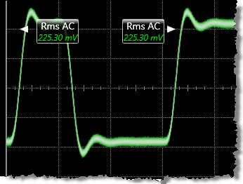 RMS is a measure of the AC or DC RMS of a pulse waveform. This measurement is compatible with PAM signals over the display, waveform, or region but not over a cycle. An annotation label is placed at the RMS result. The positions of the labels are dependent upon the configuration of the RMS measurement. You can configure the measurement to be made across the entire waveform display, a region, or across one cycle of the waveform.