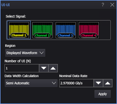 The UI-UI measurement measures the difference of two consecutive N-UI measurements. The measurement then moves over one UI and measures the difference of the next N-UIs. This is analogous to the Period-Period jitter measurement, but measures unit intervals instead of periods.