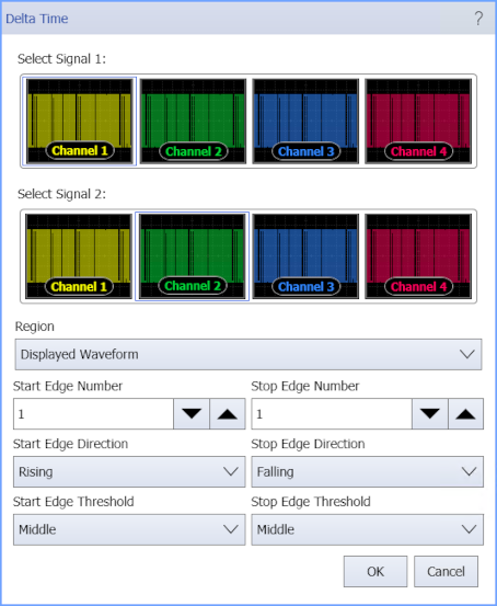 Specify the edge parameters in the Delta Time Definition tabbed page of the Configure Measurements dialog box. Define the threshold levels in the Thresholds tabbed page of the Configure Measurements dialog box. The edges you specify must appear on the display graticule.