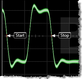 Period is a measure of the time between the first detected edge of a waveform and the next occurrence of the same type of edge. The measurement can be restricted to a region. The time between the edges of the waveform is taken at the middle threshold crossings. The default for the middle threshold is the 50% level. The period will not be calculated unless there is a complete waveform cycle visible on the display. Two waveform annotation labels mark the start and stop measurement points.