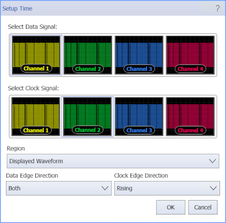When measuring over the waveform, the Setup Time measurement is made on all the cycles of the waveform including any cycles that are not in the waveform window. When measuring in a region, the Setup Time measurement is made on all the cycles inside the region only.