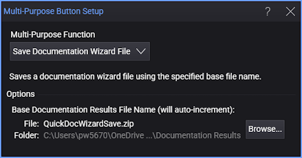 To configure the button to save a documentation wizard file, select Save Documentation Wizard as shown in this picture. The Documentation Wizard saves a zip file that includes all the information needed to archive a particular instrument configuration including setup file, screen captures, waveforms, and measurement results. To configure the contents of the documentation wizard file, click File > Documentation Wizard. When the Multi-Purpose button is pressed, the saved image file will be named by appending the current date and an incremented index number to the base file name. By default the file name is QuickDocWizardSave.zip.