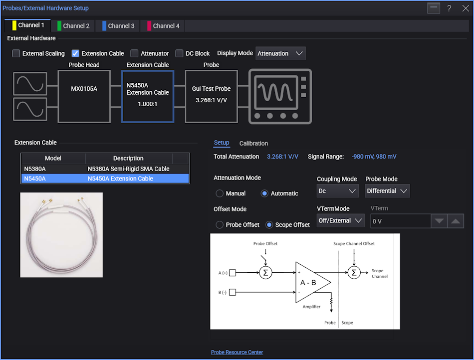 When the Extension Cable block in the Probe Setup dialog box diagram is selected, you can choose the model number of the extension cable being used.