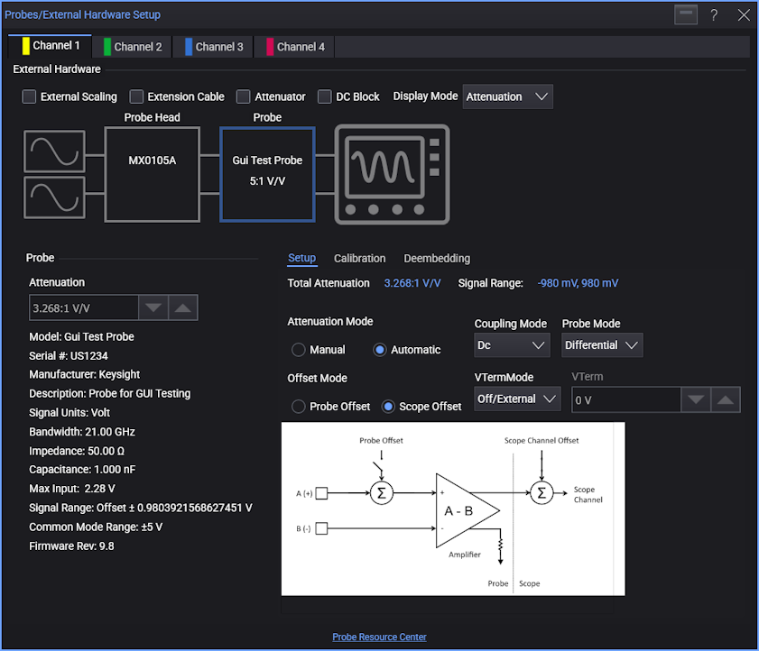 When the Probe block in the Probe Setup dialog box diagram is selected, the probe's characteristics and options are displayed in the lower portion of the dialog box.