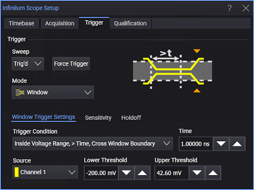 The Window trigger mode lets you specify a voltage range and then trigger when the waveform either exits this range, enters this range, stays outside the range for too long or too short a time, or stays inside the range for too long or too short a time.