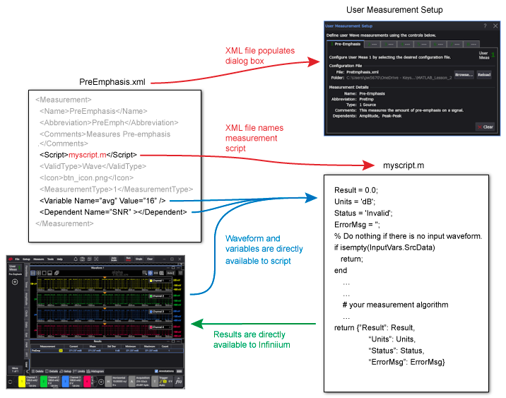To run a MATLAB based user measurement, you must create a simple XML configuration file identifies your measurement script. In addition to calling the script, the XML file populates the User Measurement Setup dialog box.