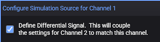 When configuring a channel on a simulated oscilloscope, the additional Define Differential Signal check box will be displayed, as shown in this picture. Select this check box if you want channel 1 and 2 to be differential. All changes that you enter for waveform 1 will be automatically entered for waveform 2.