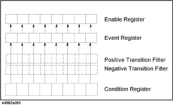 The transition filter enables you to select a positive and/or negative transition of the condition register bit in order to set a bit in the corresponding event register. For example, using the negative transition filter to set bit 3 to “1” causes bit 3 of the event register to be set to “1” when bit 3 of the condition register makes a negative transition, that is, changes from 1 to 0.