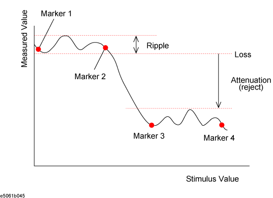 Specify the pass band with markers 1 and 2 on the trace and specify the stop band with markers 3 and 4 to obtain loss, ripple, and attenuation. The following figure shows data definitions.