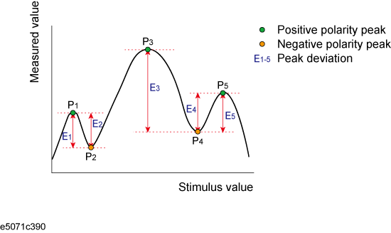 A peak is a measurement point of which the value is greater or smaller than the adjoining measurement points on its right and left sides. Peaks are classified into the following two types depending on the differences in magnitude from the measurement points on either side of it.