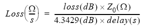This is used to determine the energy loss caused by the skin effect along the length (one-way) of the coaxial cable. Loss is defined using the unit of ohm/s at 1 GHz. If you select waveguide as the media type, this parameter is ignored. In many applications, using the value 0 for the loss should not result in significant error. The loss of a standard is determined by measuring the delay (sec.) and the loss at 1 GHz and then substituting them in the formula below.