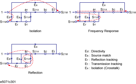 In enhanced response calibration, calibration data are measured by connecting an OPEN standard, a SHORT standard, or a LOAD standard to the output port (or a THRU standard between two ports). This calibration effectively eliminates the directivity error, crosstalk, source match error, frequency response reflection tracking error, and frequency response transmission tracking error from the test setup in a transmission or reflection test that uses those ports.