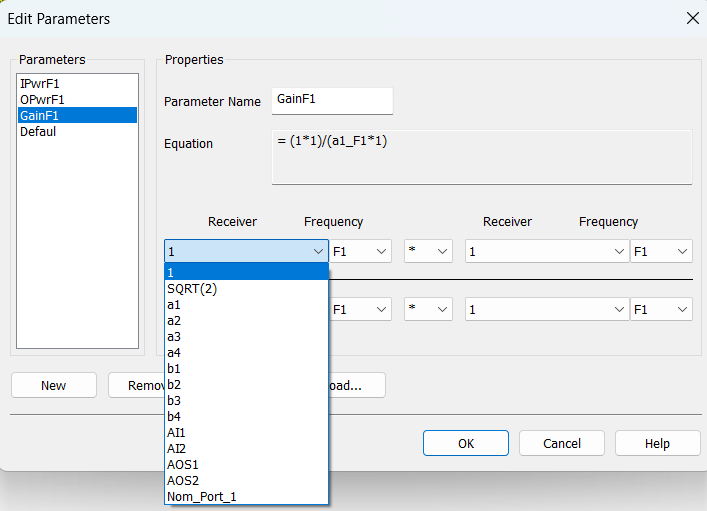ParametersSelect a predefined parameter from the list. Parameter Name - Change the 'default' name. Note: Do not use underscores in the parameter name. For example, b2_f1 cannot be used as a parameter name. However, b2f1 is a valid parameter name. Equation - Display equation result. To edit / create a parameter: Receiver - Select a receiver for which to plot measurement results. All sources which are set to "Auto On" or "Alwasy On" in the DIQ-Source Configuration Dialog will be displayed here as nominal sources. Selecting a source will result in the nominal setting of the source to be used. This might be a fixed value or swept value (ex: power sweep). Frequency - Select the frequency range over which the results will be plotted. * (Operator) - Select an operator when combining multiple receivers. For example, when calculating differential or common mode parameters. ButtonsNew - Click to create a parameter. Remove - Click to delete the selected parameter. Save - Click to store the parameter to a *.diq file for later recall. Load - Click to recall a parameter that you previously defined and saved. The following are the contents from an example *.diq file that contains the above parameters. The file can be created using the above dialog, or edited directly using the format shown below.