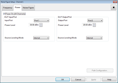 Note: S-parameter power settings are critical for accurate noise figure measurements. See Noise Figure Measurement Tips. Configures RF power settings for the S-parameter measurements that occur before noise measurements. Input power to the DUT is turned OFF during noise measurements. These settings can also be made from the normal Power setting locations. Power ON (All channels) Check to turn RF Power ON for all channels. DUT Input PortInput Port - Select a VNA port to be connected to the DUT input. Note: Input power levels are critical for accurate noise figure measurements. Learn more. Power Level The input power to the DUT during S-parameter measurements. Source Attenuator Auto Check to automatically select the correct attenuation to achieve the specified input power. Clear, then select attenuator setting that is used achieve the specified Power Level. Learn more about Source Attenuation. All VNA channels in continuous sweep must have the same attenuation value. Learn more. Receiver Attenuator Specifies the receiver attenuator setting for input port. (M938xA) Source Leveling Mode Specifies the leveling mode. Choose Internal. Open Loop should only be used when doing Wideband Pulse measurements (not available with Noise figure measurements). DUT Output PortOutput Port - Select a VNA port to be connected to the DUT output. Output Power Sets power level in to the output port for reverse sweeps. Port power is automatically uncoupled. Reverse sweeps are always applied to the DUT when Full 2-port correction is applied. Enhanced Response Cal is NOT available for noise figure measurements. Source Attenuator Specifies the source attenuator setting for reverse power. Receiver Attenuator Specifies the receiver attenuator setting for the output port. (M938xA: Receiver Configuration) Source Leveling Specifies the leveling mode. Choose Internal.