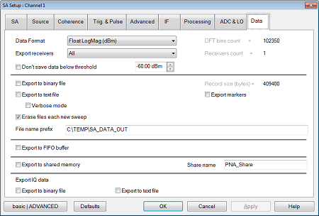 Export to binary file - Set data to be exported to a binary file. Data is not exported until the next new sweep occurs. Export to text file - Exports data only. Data is not exported until the next new sweep occurs. Verbose mode - Exports frequency and data. Data is not exported until the next new sweep occurs. Erase files each new sweep - Selecting this option will erase the data after each sweep. If this option is not checked, the data from each sweep will continue to be appended to the output data file which can create a very large file size (and fill the disk, with many unwanted consequences). File name prefix - The receiver selected in Export receivers will be appended to the prefix name specified in this field with either ".txt" if a text file is exported or ".bin" if a binary file is exported. For example, if C:\Temp\SA_DATA_OUT is entered into the File name prefix field and the "B" receiver data is exported to a text file, the data will be exported to a file called SA_DATA_OUT_B.txt. Record size (bytes) - This is the byte size of binary data output. Export markers with data files - Adds marker data and data to the text file (*.txt) output. Export all markers to a single file - Adds all marker data to a single text file (*.txt) output.