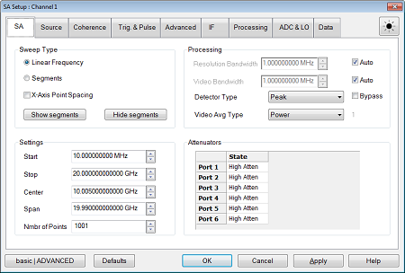 Sweep Type - Sets the spectrum analysis sweep type. See Type (Sweep). Show segments - Displays the segment table at the bottom of the display. Number of points for each segment cannot be specified. Hide segments - Hides the segment table. Processing Resolution Bandwidth - Provides the ability to resolve, or see closely spaced signals. The narrower (lower) the Resolution Bandwidth, the better the spectrum analyzer can resolve signals. In addition, as the Resolution Bandwidth is narrowed, less noise is measured by the spectrum analyzer ADC and the noise floor on the display lowers as a result. This allows low level signals to be seen and measured. However, as the Resolution Bandwidth is narrowed, the sweep speed becomes slower. Auto - Check to couple Resolution Bandwidth to the frequency span in a ratio based on the Span/RBW setting. As the frequency span is narrowed, the Resolution Bandwidth is also narrowed providing increased ability to resolve signals. Clear to uncouple the settings. Video Bandwidth - Sets the video averaging factor. The averaging operation is applied after the DFT (Discrete Fourier Transform) and before the image rejection. The trace data is smoothed with the method selected by the Video Averaging Type. More smoothing occurs as the Video BW is set lower. However, as the Video BW is narrowed, the sweep speed becomes slower. The Video Bandwidth can be set from 3 Hz to 3 MHz when Auto is deselected. The VBW feature is emulated with averaging (see below the Averaging count). The averaging factor is computed with this equation: Round(0.8 + 0.38 * RBW / VBW). Auto - Check to couple the Resolution Bandwidth to the Video Bandwidth in a ratio based on the RBW/VBW setting. Clear to uncouple the settings. Detector Type - A "detector" is an algorithm used to map DFT bins into display buckets. There are typically several DFT bins in a single display bucket, and the detector determines how to translate the multiple DFT values into a single display value. Peak - Displays the maximum value of all the measurements in each bucket. This setting ensures that no signal is missed. However, it is not a good representation of the random noise in each bucket. Average - Displays the Root Mean Squared (RMS) average power of all the measurements in each bucket. This is the preferred method when making power measurements. Sample - Displays the center measurement of all the measurements in each bucket. This setting gives a good representation of the random noise in each bucket. However, it does not ensure that all signals are represented. Normal - Provides a better visual display of random noise than Positive peak and avoids the missed-signal problem of the Sample Mode. Should the signal both rise and fall within the bucket interval, then the algorithm classifies the signal as noise. An odd-numbered data point displays the maximum value encountered during its bucket. An even-numbered data point displays the minimum value encountered during its bucket. If the signal is NOT classified as noise (does NOT rise and fall) then Normal is equivalent to Positive Peak. NegPeak- Displays the minimum value of all the measurements in each bucket. Peak Sample - Attempts to determine if the display bucket contains an actual signal, or just noise. If a signal is present, the Peak detector is used, otherwise Sample is applied. Peak Average - Attempts to determine if the display bucket contains an actual signal, or just noise. If a signal is present, the Peak detector is used, otherwise Average is applied. Fast Peak - Keeps the x-axis grid untouched and indicates the value of the largest DFT bin from the bucket behind each display point. Bypass - Check to bypass the Detector Type to view all display points from the DFT. This is only available if the total number of DFT points can be handled by the display. Video Averaging Type - Determines how to compute the video average. When Auto is selected, the optimum type of averaging for the current instrument measurement settings is selected. It averages the magnitude of the DFT bins. Averaging only applies if the video bandwidth is less than the resolution bandwidth. Voltage - Selects averaging of the detected signal's magnitude and returns the result. Power - Selects averaging of the detected signal's squared magnitude and returns the square root of the result. Log - Selects averaging of the detected signal's natural logarithm of the magnitude and returns the exponentiated value of the result. Voltage Max - Returns the maximum voltage (signal magnitude) measured during the averaging period. Voltage Min - Returns the minimum voltage (signal magnitude) measured during the averaging period. Averaging Count - Reads the number of Video bandwidth sweeps that are averaged together. This readout is displayed to the right of the Averaging Type selection (the small "1" shown in the dialog above). It can be read with the remote interface using the SENS:SA:BAND:VID:AVER:COUNt? command. Sets the SA (receiver) frequency range when running Linear Frequency sweep type. Use either of the following pairs of settings to determine the frequency range. Start /Stop - Specifies the beginning and end frequency of the swept receiver range. Start is the beginning of the X-axis and Stop is the end of the X-axis. When the Start and Stop frequencies are entered, then the X-axis annotation on the screen shows the Start and Stop frequencies. Center /Span - Specifies the value at the center and frequency range. The Center frequency is at the exact center of the X-axis. The Frequency Span places half of the frequency range on either side of center. When the Center and Frequency Span values are entered, then the X-axis annotation on the screen shows the Center and Span frequencies. Number of Points - Selects the number of trace points on the display. When the Detector is bypassed, the number of display points is read only, it shows the current DFT points to cover the RF span. Note: When running Segments,