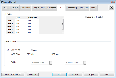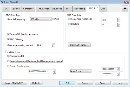 Advanced >> button - Accesses the IF, Trigger, Processing, ADC & LO, and Data dialogs.