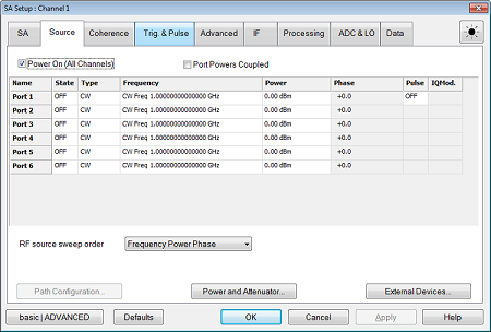 CW - The source is set to a CW frequency. LinFreq - The source is set to sweep from the Start to Stop frequency. Power - The source is set to a power sweep. Phase - The source is set to a phase sweep. LinF+Pwr, Freq+Pha, Pow+Pha, Fr+Pw+Ph - Multi-parameter sweep for the specified parameters. Set the range of sweep for each parameter. Frequency - Click in the cell, then click Edit, to start the Frequency Settings dialog (below). Power - Sets the power level at the output of the source. Click in the cell, then click Edit, to start the Power Settings dialog (below). Phase - Control source phase of a VNA source or external source. Enable multitone and Compute Phase should be turned on. Pulse - Enable/disable pulse measurements. Learn more. IQMod. - Modulated I/Q file. Clicking Edit accesses a dialog for setting up an I/Q modulated file that is sent to a source for measuring Noise Power Ratio (NPR). Refer to the Noise Power Ratio (NPR) Settings topic for descriptions of the modulation dialogs. RF source sweep orderFrequency Power Phase - Sweep from Start to Stop frequency first then sweep power then sweep phase. Power Frequency Phase - Sweep power first then sweep from Start to Stop frequency then sweep phase. Phase Frequency Power - Sweep phase first then sweep from Start to Stop frequency then sweep power. Phase Power Frequency - Sweep phase first then sweep power then sweep from Start to Stop frequency. Frequency Phase Power - Sweep from Start to Stop frequency first then sweep phase then sweep power. Power Phase Frequency - Sweep power first then sweep phase then sweep from Start to Stop frequency. ButtonsPower and Attenuator Learn more External Devices Learn more |