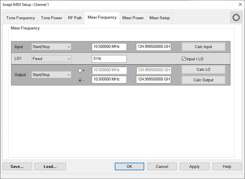 On the Mixer Frequency tab, select Start/Stop, or Center/Span for each range to be swept.