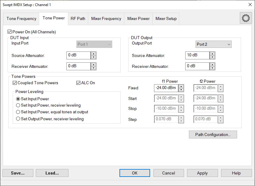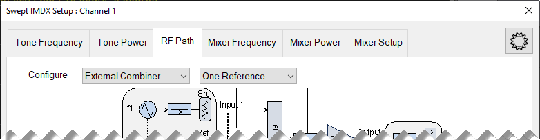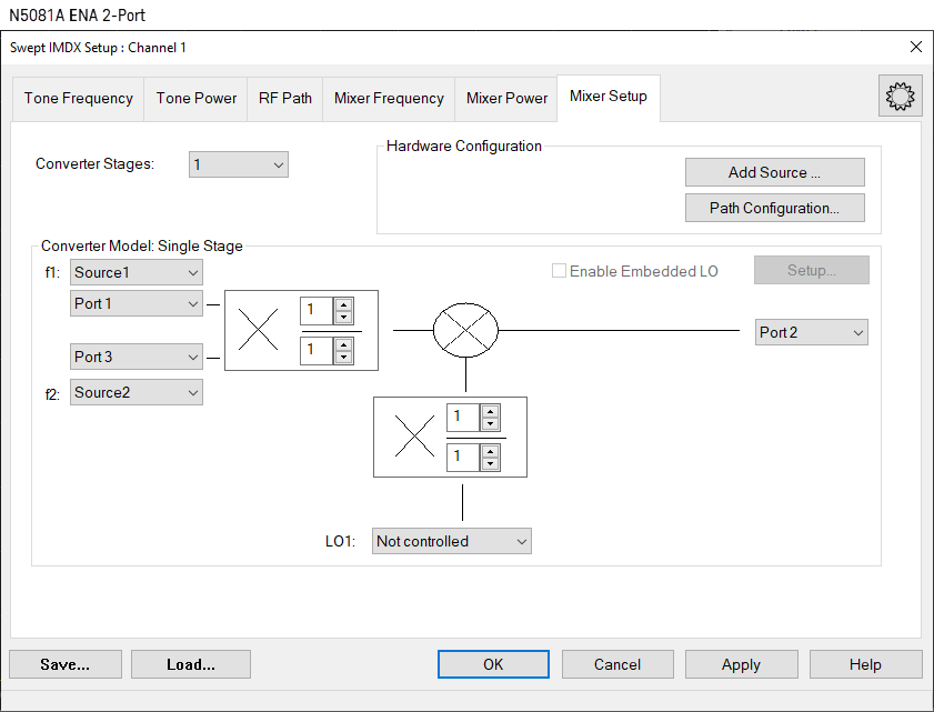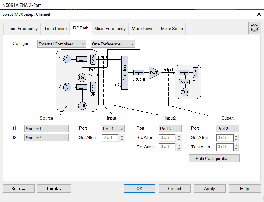 Converter Stages Choose from 1 or 2 stage DUT (# of LOs). Converter ModelLearn how to configure an external source and combiner to make Swept IMD and IMDx measurements. f1 Always uses VNA internal source 1. This is a live combo box, displaying the same value found on the RF Path tab. Input (Port n) Normally Port 1 is used. This selection is available to allow the two tones to be routed through port 3 on 4-port VNA models. Learn more. If the configuration is "Internal Combiner," (PNA-X and PNA-X Pro only) then this is a single combo box which displays the same value as found on the RF Path tab. If the configuration is not "Internal Combiner," then this is two combo boxes, where the upper box represents "Input 1" and the lower box represents "Input 2" as found on the RF Path tab. f2 Select a source to be used for the f2 tone. This selection is available when an external source is configured and the "Active" box is checked on the External Source Configuration dialog. This is a live combo box, displaying the same value found on the RF Path tab. LO1 Select the source to use for the specified LO. Available for selection when an external source is configured and the "Active" box is checked on the External Source Configuration dialog. Output (Port n) Available for selection on 4-port VNA models. Select the VNA port to connect to the DUT Output. This is a live combo box, displaying the same value found on the RF Path tab. Fractional Multipliers - Learn more. Hardware ConfigurationAdd Source Click to configure an external source using the External Source Configuration dialog. Path Configuration Click to launch the Path Configuration dialog (PNA-X models only). |