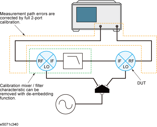 The calibration mixer is required for supporting the measurement system of the up/down conversion. You must also evaluate in advance the frequency response characteristics of the calibration mixer. The vector-mixer calibration method obtains the characteristics of the measured mixer alone by using the network de-embedding function to eliminate the characteristics of the calibration mixer from the measurement result. You can use the IF filter to select any required frequency conversion component such as RF+LO, RF-LO, and LO-RF. The calibration mixer and IF filter can be seen as a part of the test system setup, just like the network analyzer and the test cable; they are connected at the same location during the entire calibration or measurement.