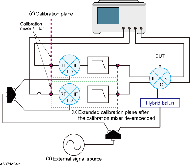 You should keep the following electrical lengths the same between the two ports to which the calibration mixer is connected as much as possible - the electrical length from the external signal source output port (a) to the extended calibration plane (b), and the electrical length from the calibration plane (c) to the extended calibration plane (b). Large electrical length differences between the two ports to which the calibration mixer is connected could raise 180 degrees phase value error between the two IF ports even though the Balanced Mixer Calibration Macro is executed. You can verify it by swapping the IF cable connections with each other.