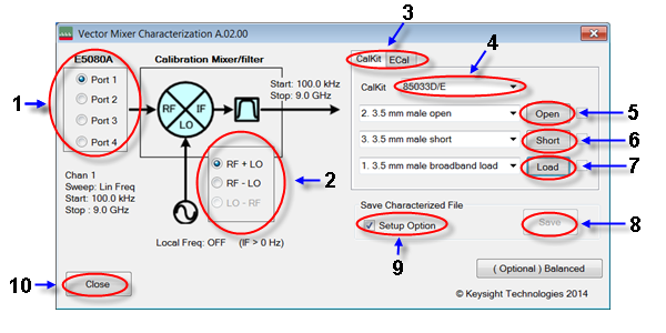 Note: The mechanical calibration kit displayed in the Vector Mixer Characterization macro is the frequency registered in the VNA and read from it. If an ECal module is connected to the VNA, ECal will be selected automatically.