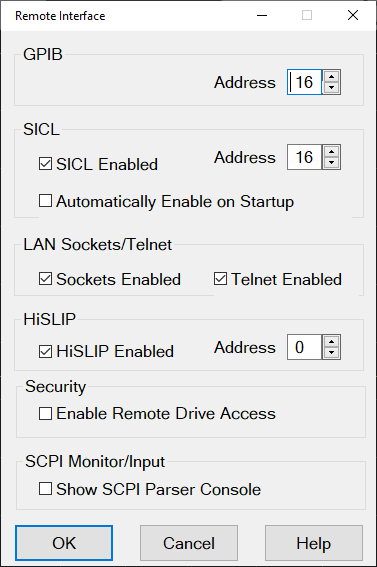 HiSLIPHiSLIP has the same functionality as VXI 11 (SICL) with better performance. Therefore, it is enabled by default on the analyzer. Address 0 by default. No change is necessary. On the remote computer, use address string TCPIP0::<hostname>::hislip<address>. ("hislip" is case-sensitive). SecurityEnable Remote Drive Access When checked allows access to the hard disk. The default is unchecked. When unchecked, hard disk access is blocked and any of the following commands will return an error: MMEM:CAT:FILE? MMEM:CAT:STAT? MMEM:CAT:CSTAte? MMEM:CAT:CSARchive? MMEM:CAT:CORRection? MMEM:CDIR? MMEM:COPY MMEM:DELete MMEM:MOVE MMEM:MDIRectory MMEM:RDIRectory MMEM:TRANsfer[?] SYST:SHORcut:EXECute SCPI Monitor / InputShow SCPI Parser Console Launches a window that is used to send single SCPI/GPIB commands from the analyzer keyboard. This window can also be used to capture the SCPI traffic used over HiSLIP. (See also, SCPI Parser Console.)