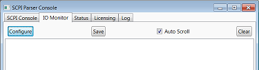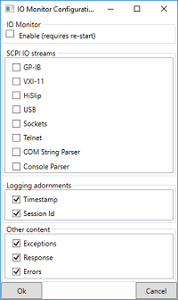 IO Monitor enables monitoring activity on the remote control. Clicking on the Configure button accesses the IO Monitor Configuration dialog to enable/disable this function. Enabling the IO monitor provides detailed error message with debug information. Example of Error message: