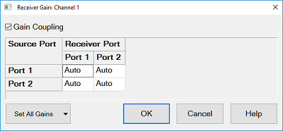 Gain Coupling: When this is checked, the receiver gain can be set from Auto/High/Low. When this is not checked, the selection is disabled and RF attenuator and IF gain can be set independently at the Path Configurator. Note: On the E5081A 4 port configuration, When "Manual" is selected, Persouce is applied for ports 3 and 4 because there is no RF & IF path configuration on these ports. Note: In "Manual", the receiver gain for Bypass 20 GHz/44 GHz is fixed at a certain value according to the frequency. Note: When the receiver gain is set at AUTO, the gain is fixed at LOW when the "RF In Switch" selects "External".