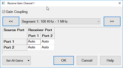 In Sweep Segment Table Dialog, Check the check box of Receiver Gain. E5080B E5081A This dialog provides basic control receiver gain of the specified segment for a specific port in the segment sweep. The receiver gain in Segment Table dialog box should be turned on, then click Edit under Rev Gain column in the Segment Table, The setting description is the same as the Receiver Gain above. |