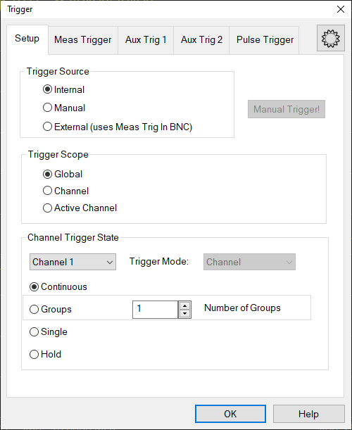 View the interactive Trigger Model animation to see how triggering works. Trigger SourceThese settings determine where the trigger signals originate for all existing channels. A valid trigger signal can be generated only when the analyzer is not sweeping. Internal Continuous trigger signals are sent by the analyzer as soon as the previous measurement is complete. Manual One trigger signal is sent when invoked by the Trigger button, the active tool bar, or a programming command. External Trigger signals received from the trigger source. The trigger source can be defined in External and AUX Triggering. Pulse3 Trigger signal using internal Pulse3 to Meas Trig In bypass. Pulse3 can be defined in the Pulse Generators Setup dialog. Manual Trigger! - Manually sends one trigger signal to the analyzer. Available ONLY when Manual trigger is selected. Trigger ScopeThese settings determine what is triggered. Global All channels not in Hold receive the trigger signal [Default setting] Channel Only the next channel that is not in Hold receives the trigger signal. This is not obvious or useful unless Trigger Source is set to Manual. This setting enables Point Sweep mode. Active Channel - Trigger are sent only to the active channel. The active channel does not change. Channel Trigger StateThese settings determine how many trigger signals the channel will accept. Continuous The channel accepts an infinite number of trigger signals. Groups The channel accepts only the number of trigger signals that is specified in the Number of Groups text box, then goes into Hold. Before selecting groups you must first increment the Number of Groups text box to greater than one. Number of Groups Specify the number of triggers the channel accepts before going into Hold. If in Point Sweep, an entire sweep is considered one group. First increment to desired number, then select 'Groups'. Single The channel accepts ONE trigger signal, then goes into Hold. Another way to trigger a single measurement is to set Trigger Source to Manual, then send a Manual trigger. However, ALL channels are single triggered. Hold The channel accepts NO trigger signals. See also this Keysight support article: HOW TO ACQUIRE DATA USING AVERAGES ON A VNA WITH SCPI EXAMPLE IN PYTHON Trigger ModeThese settings determine what EACH signal will trigger. Sweep and Point modes are available ONLY when both Trigger Source = MANUAL or EXTERNAL AND Trigger Scope = CHANNEL.