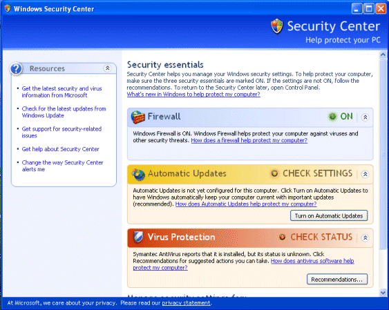 To check the status or make changes in the security settings for you test set, open the Windows Security Center. To open Windows Security Center, click Start, click Control Panel and then double-click Security Center. The following image shows an example of the Windows Security Center window.