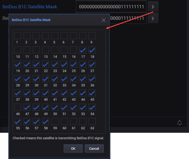 button displayed with this field to edit this setting in the BeiDou B1C Satellite Mask dialog box as shown below.