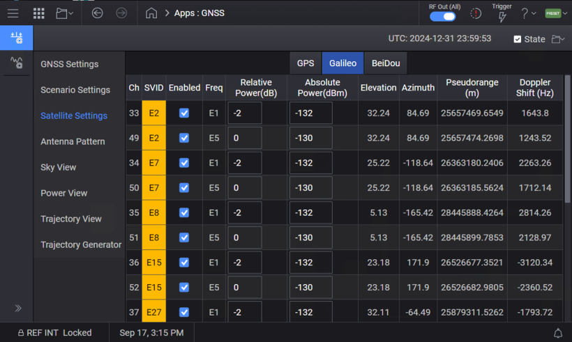 Satellite power reference is the absolute power of one satellite signal with 0dB relative power. When real-time application is turned on, the amplitude on the front panel will be set to satellite power reference. When satellite power reference is changed, the amplitude on the front panel will also be updated.